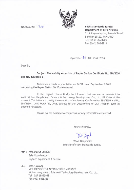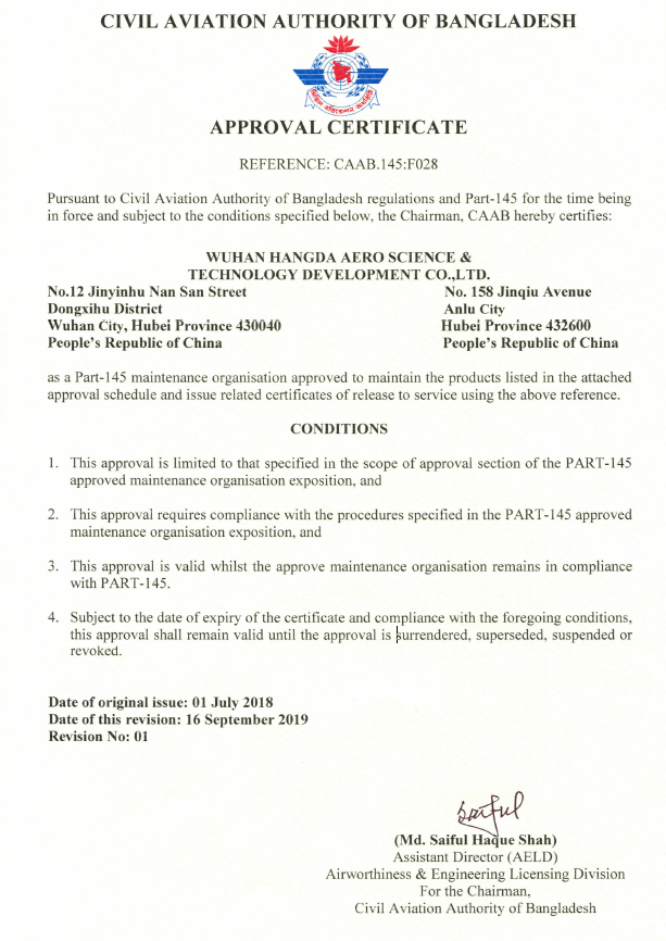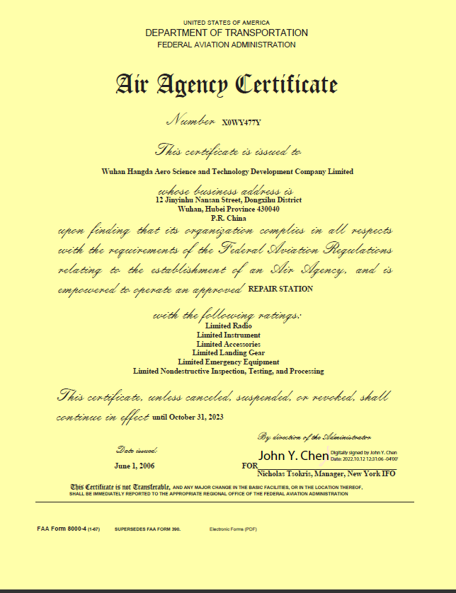 2001年10月 公司獲中國(guó)民航總局授權(quán)的民航維修許可證。